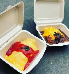 ケチャップは昔ながらの包むオムライス。デミオムライスは半熟玉子をのせます。